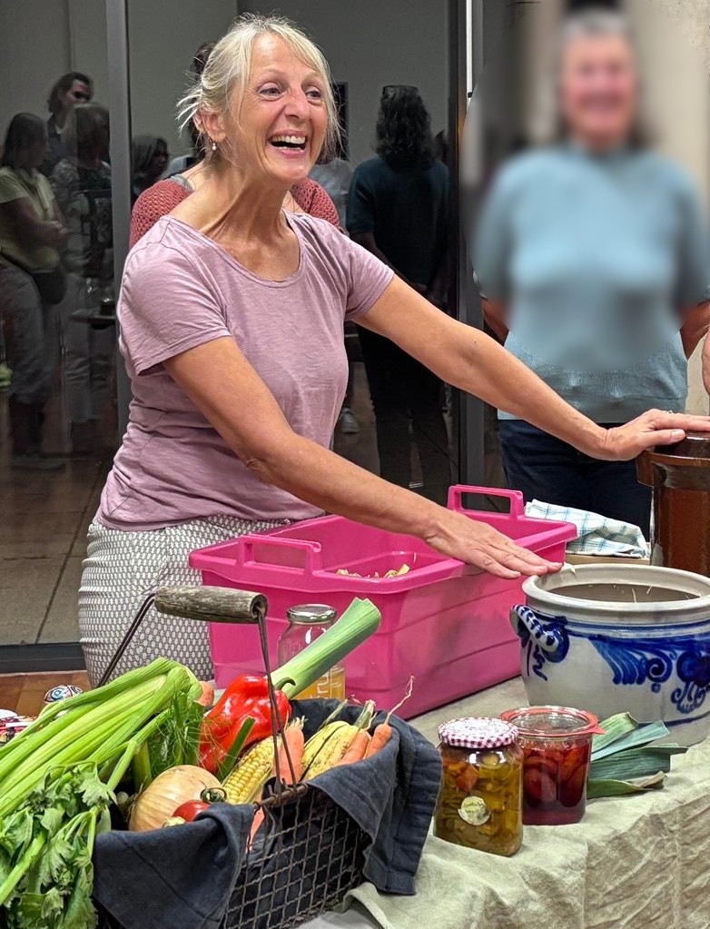 "Vom Beet ins Glas" Am Freitag, den 19. September 2025 war Gerti Epple mit ihrem öffentlichen Impulsvortrag "Vom Beet ins Glas" zu Gast in Niederwangen. Die erfahrene Fachfrau für Selbstversorgung erklärte die insgesamt 9 verschiedenen Methoden des Haltbarmachens von Gemüse und Obst und hatte zudem allerhand Tipps und Tricks fürs einfache Gelingen zuhause im Gepäck. Besonders hob Gerti Epple die nachhaltige Lebenshaltung durch den bewussten Einkauf von regionalen Produkten hervor. Auch das soziale dürfe seinen Raum haben, "lieber statt Fernseh gucke, oimol Marmelade machen. Des isch echte Gemeinschaftsarbeit". Es war ein kurzweiliger Abend in geselliger Runde für ein breites , interessiertes Publikum. Die Vortragsreihe soll 2026 fortgesetzt werden. Wer Themenanregungen / Ideen hat, gerne per Mail an verarbeitung@solawi-wangen.de senden.